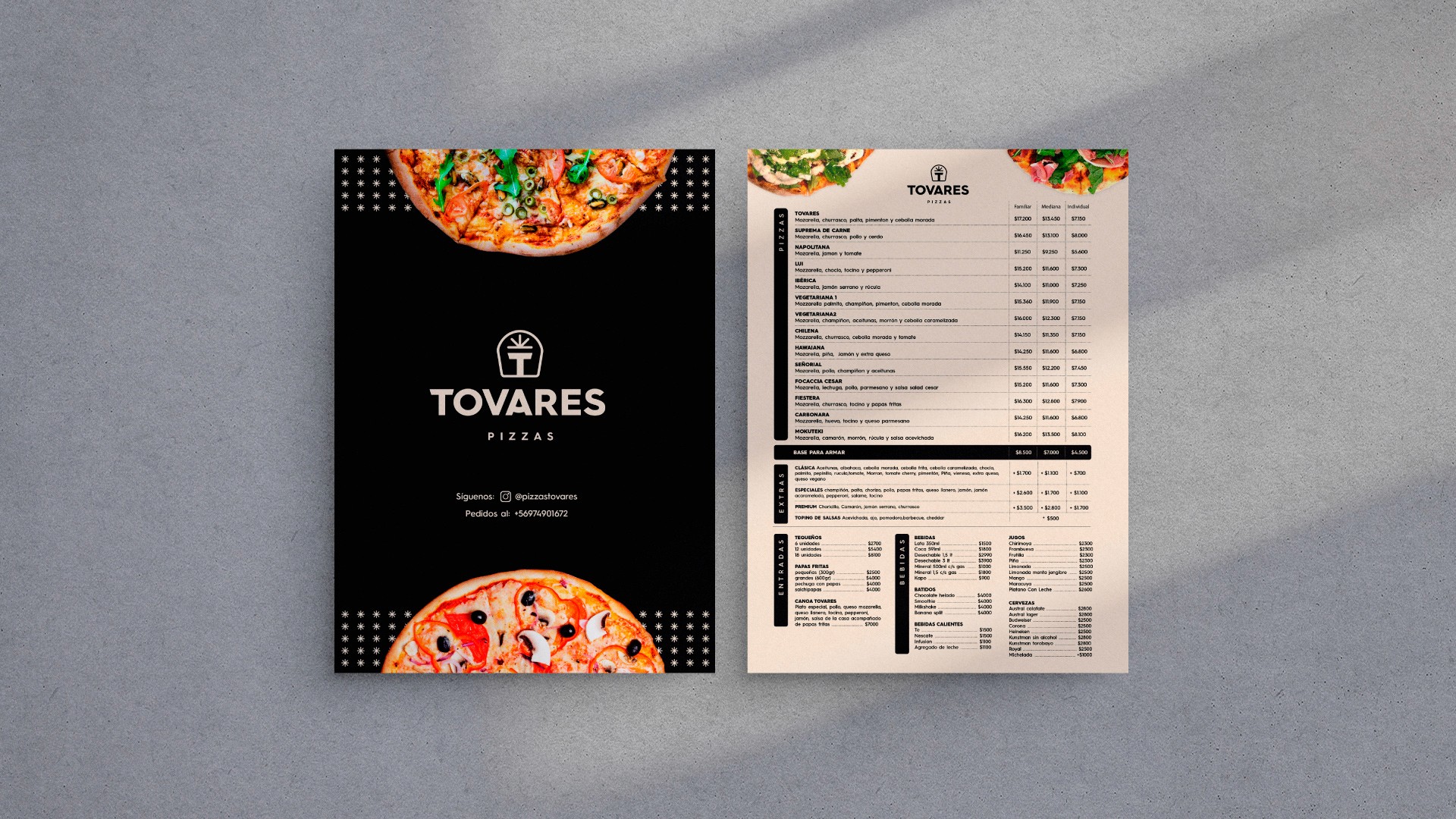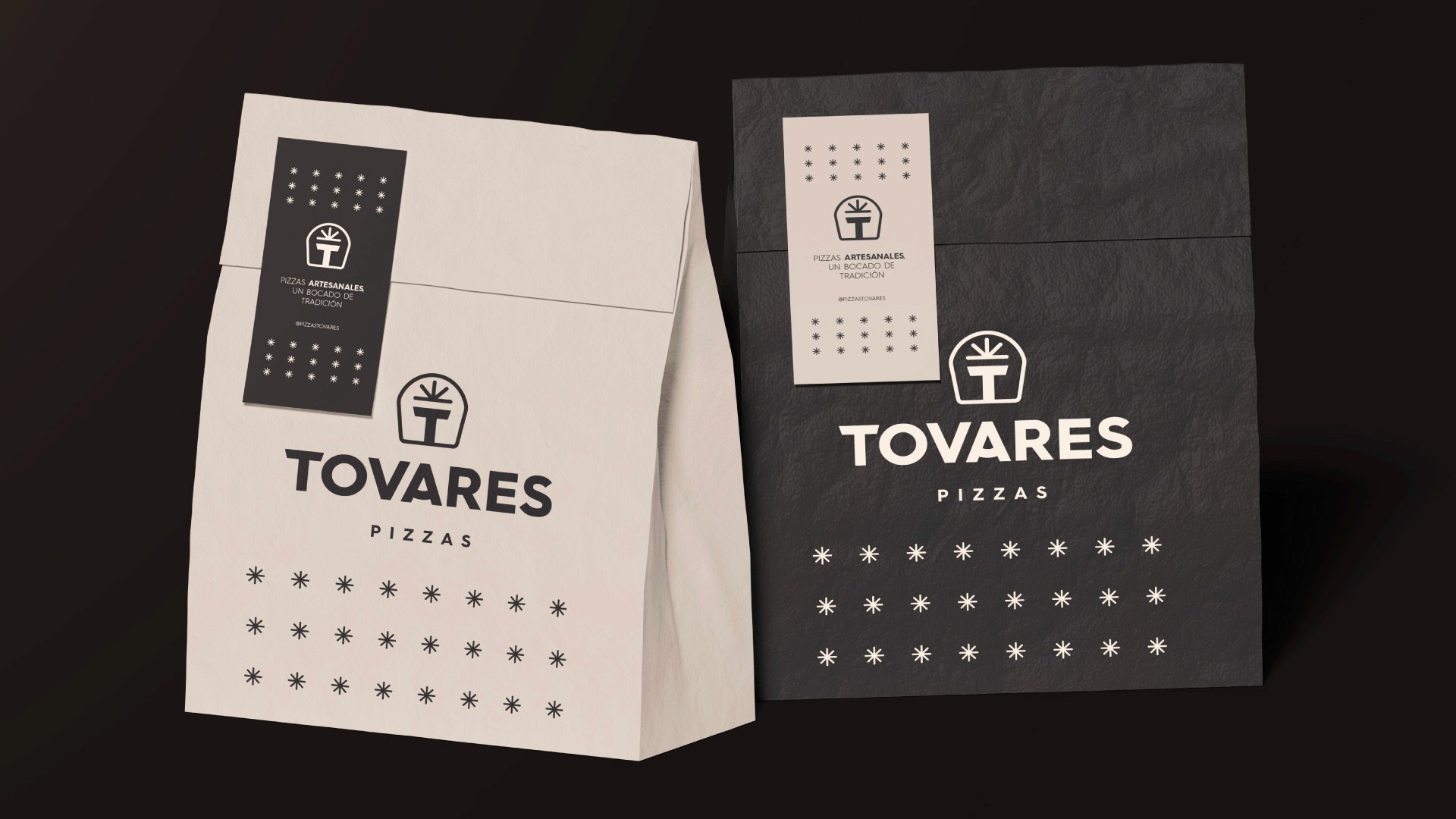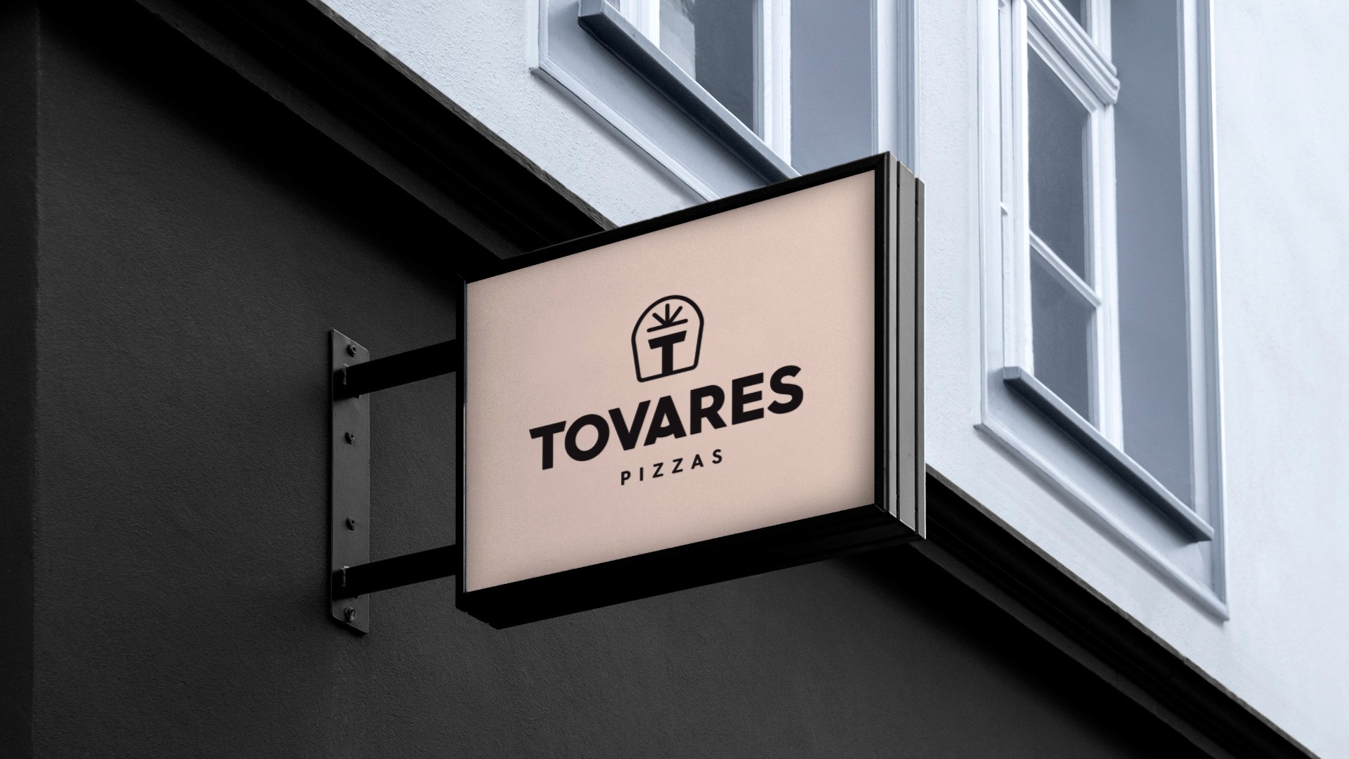 El isotipo se diseñó con varios significados integrados: la forma curva del contorno evoca la pala con la que se saca la pizza del horno, las líneas superiores representan el corte de una pizza, y todo se combina con la inicial T de Tovares, formando un escudo familiar que transmite tradición y pertenencia. Se trabajó con una tipografía moderna y de lectura clara para reforzar la elegancia y cercanía de la marca. La paleta cromática —negro para aportar sobriedad y carácter, junto a beige para transmitir calidez— consolida un equilibrio entre sofisticación y familiaridad.
